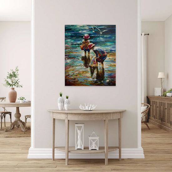 Explore 'Beach Buddies' by Brent Heighton, an embellished giclee 4/25 sized 39 x 32 inch, capturing a heartwarming moment of childhood wonder and friendship by the shimmering seaside.