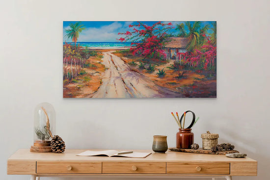 Jonn Einerssen's 'Cerritos Road' is an evocative 20 x 40 inch oil painting on canvas, capturing the essence of Baja's picturesque landscapes. The warm tones of the sandy road, flanked by the vivid pink hues of blooming bugambilia and tranquil palm silhouettes, guide the viewer's eye towards the blue horizon.
