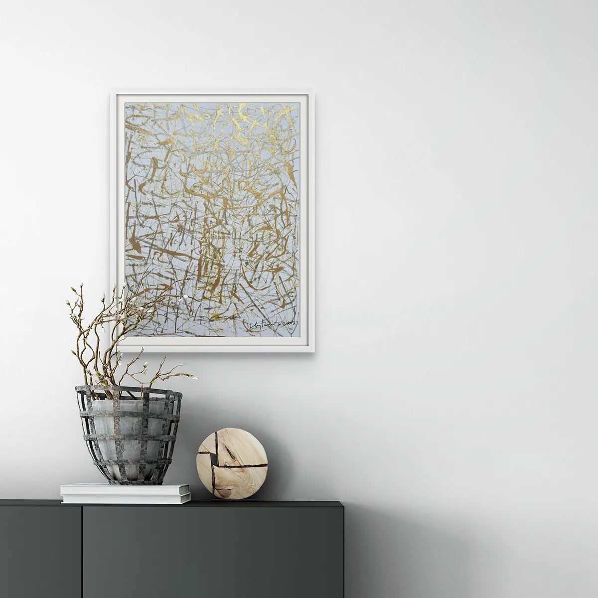 Discover the essence of abstract expression with 'Cuerpos 2' by Eloy Tarcisio, a masterpiece of mixed media on paper, sized 12.5 x 9.2 inch. This piece boasts a complex network of golden and earthy tones that crisscross in a harmonious symphony, capturing the viewer's gaze.