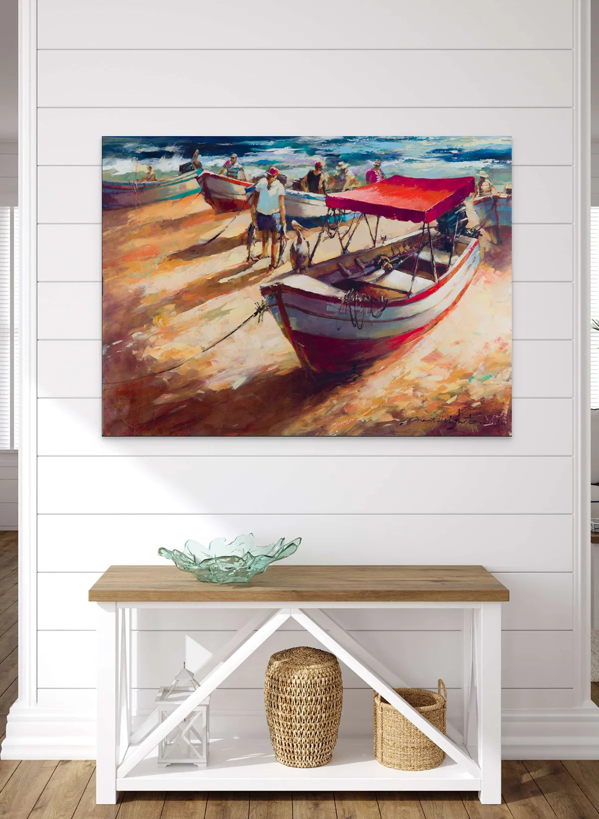 Immerse yourself in the coastal vibrance of 'Happy Hour' by Brent Heighton, a limited edition embellished giclée 3/25, size 32 x 44 inches. This artwork celebrates the end-of-day hustle with fishermen and boats basking in the golden hour's light.