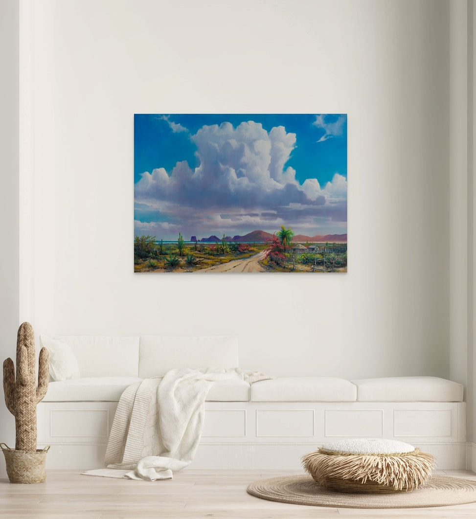 Jonn Einerssen's "Memories in Paradise" is a 30 x 40 inches oil on canvas that richly illustrates the timeless beauty of Los Cabos, Mexico. It offers a nostalgic glimpse into the region's history. Vibrant colors and serene views capture the essence of a bygone era.