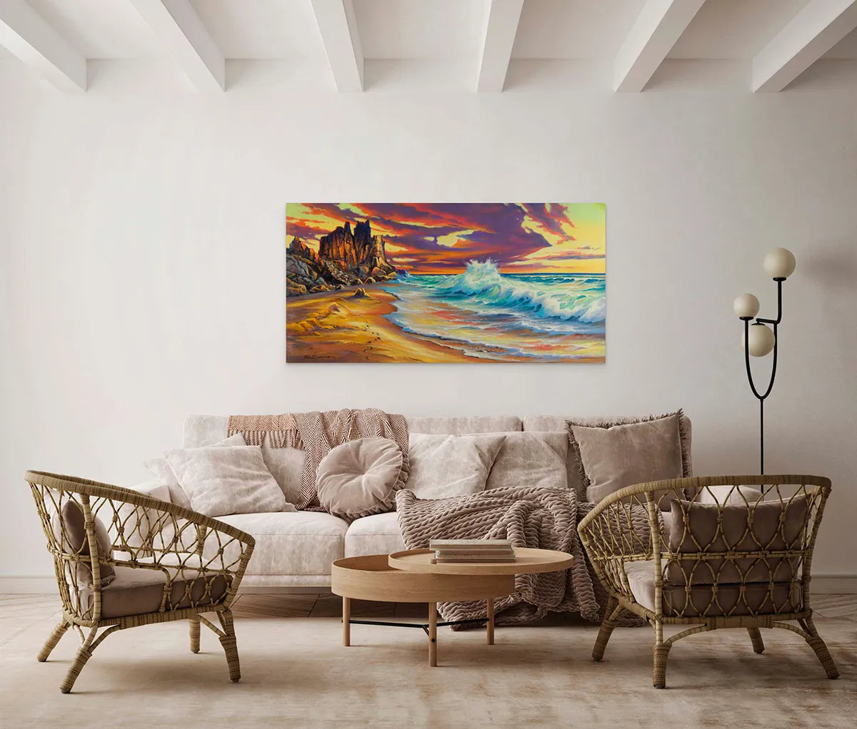 Jonn Einerssen's 'Morning Light' presents a vibrant marine landscape in oil on canvas, sized 24 x 47.5 inches. The artwork features the first golden rays of sunlight piercing through a dynamic sky, illuminating the rugged coastline and energetic surf, encapsulating the tranquil yet powerful essence of dawn.