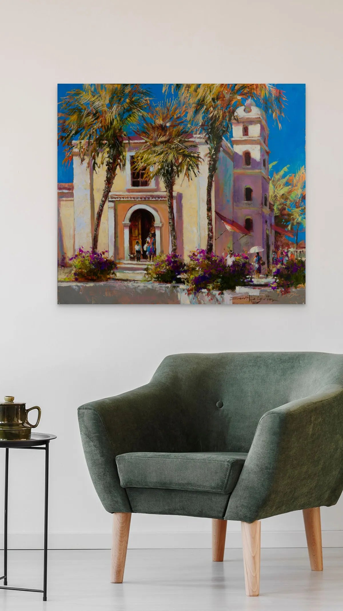 Discover 'Once Upon a Time" by Brent Heighton, a vivid 31.5 x 35.4 inch acrylic that captures the serene beauty of a historic building in San José del Cabo amidst lush palms.