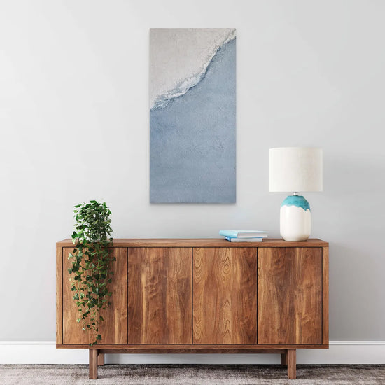 Karina Velasco's 'Rompe Hielos' is an artistic exploration of texture and color, rendered on a 39.3 x 19.6 inch canvas. This piece is a celebration of the sensory interplay between the cool, soothing blues and the subtle, inviting textures that beckon a closer look.
