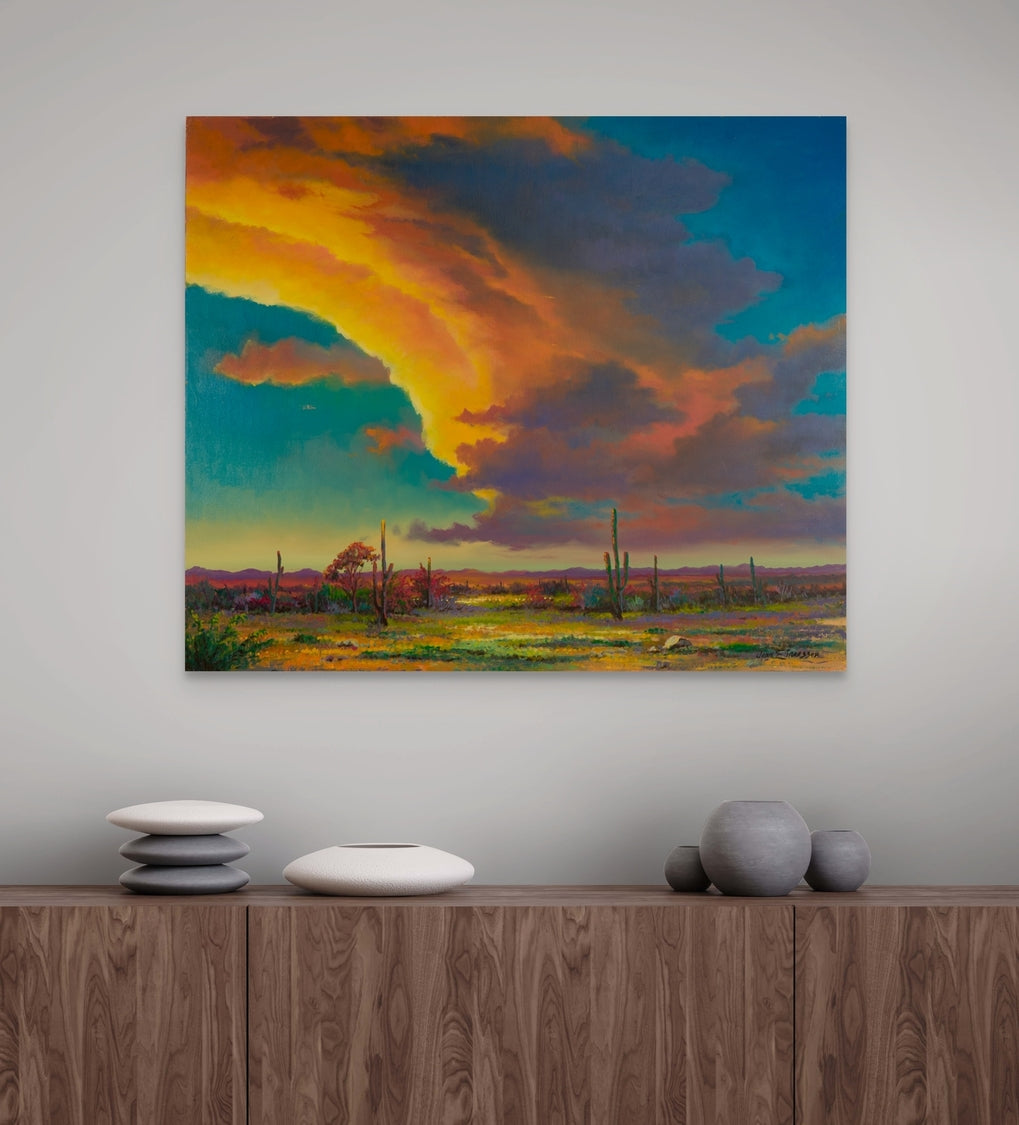 Jonn Einerssen's 'Sky Power ' is a breathtaking 30 x 35. 7 inch oil on canvas that portrays the transformative power of seasonal rains over a desert landscape. Vivid clouds cascade in warm colors above, reflecting the fiery life-giving force against the stoic desert cacti.