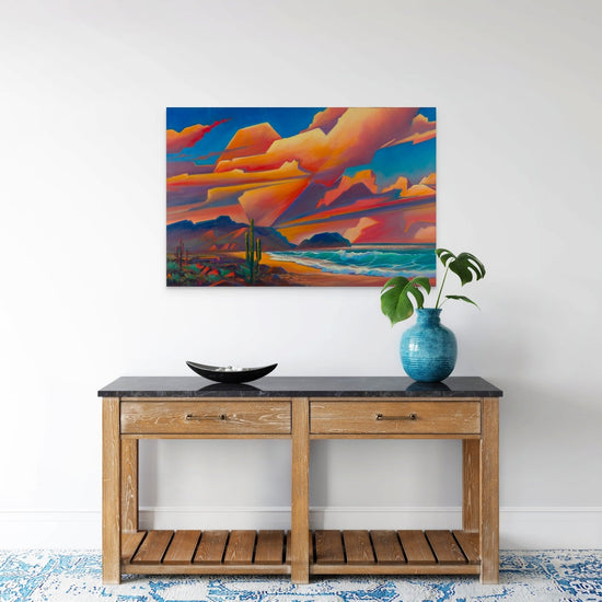 Jonn Einerssen's 'Todos Santos' is a mesmerizing oil on canvas, size 24 x 36.5 inches, where the fiery drama of a sunset sky meets the tranquil blues of the Pacific, framed by the silhouettes of cacti and the distant mountains.