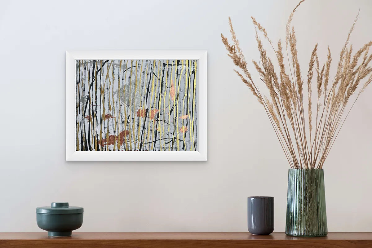 Explore the intricate play of line and color in Eloy Tarcisio's 'Vista Horizonte'. This mixed media on paper artwork measures 9.2 x 12.4 inches.Golden hues intertwined with shades of black and grey create a harmonious visual rhythm, reminiscent of a horizon line amidst a field of reeds or a dense forest. This artwork captivates with its minimalist approach, inviting contemplation on the simplicity and complexity of nature's patterns.